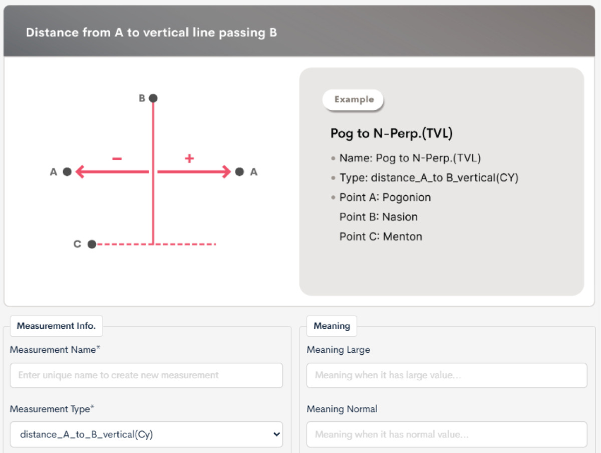 Dear Doctor, thank you for your inquiry. Currently, WEBCEPH does not support drawing auxiliary lines such as the True Vertical Line (TVL) itself. However, it is possible to measure the distance from a specific point to a TVL passing through a defined landmark. For example, suppose you would like to measure the horizontal distance from the TVL passing through Glabella to Pronasale. In this case, please select distance_A_to_B_vertical(Cy). Then, set Point A as the target point (in this example, Pronasale), Point B as the reference point on the TVL (Glabella), and Point C as any inferior landmark that can serve as the lower boundary of the TVL, such as Menton. This will allow you to measure the horizontal distance from the TVL passing through Glabella to Pronasale. Thank you.