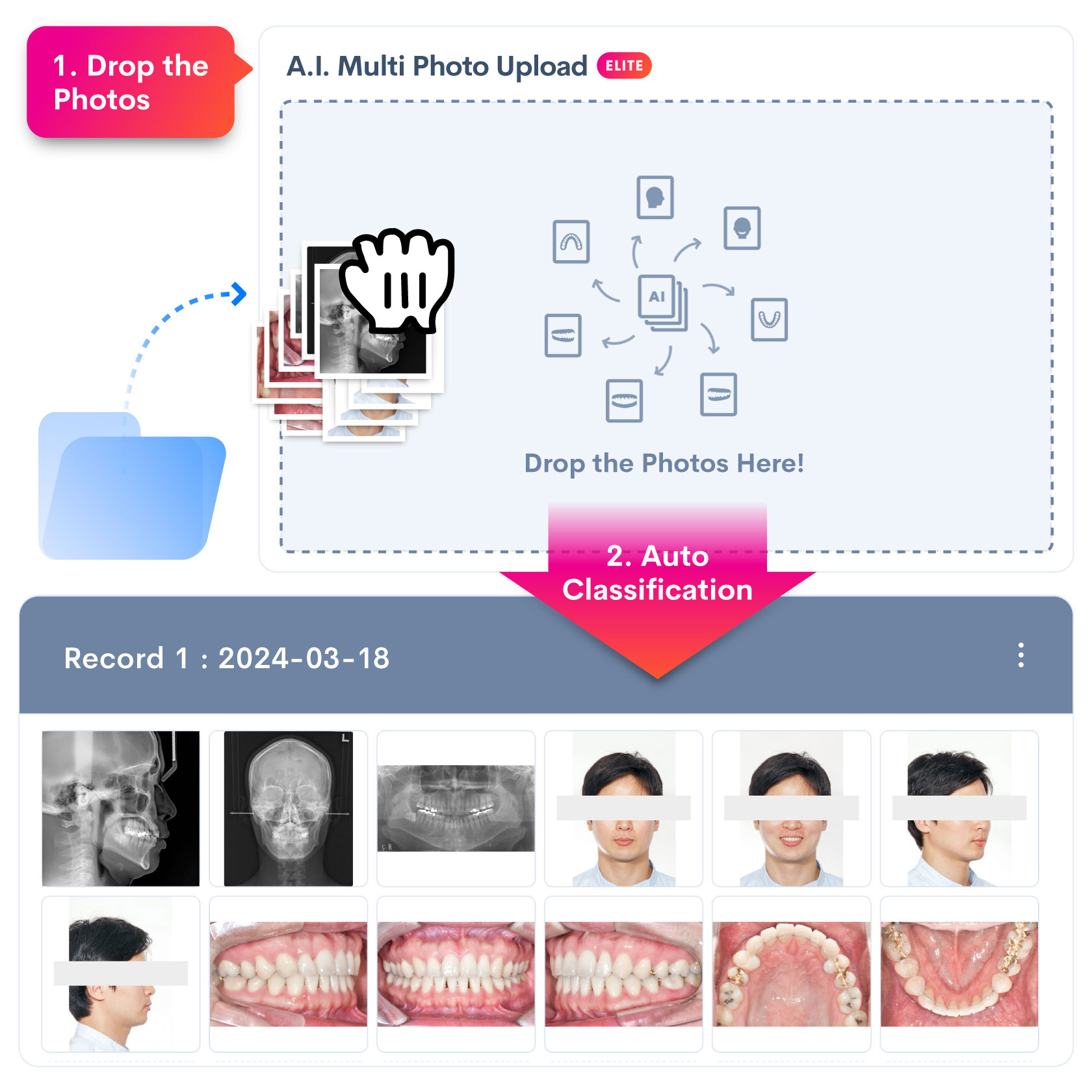 O modelo de inteligência artificial do WebCeph Elite automatiza o envio de fotos clínicas, reduzindo ainda mais o tempo de diagnóstico.