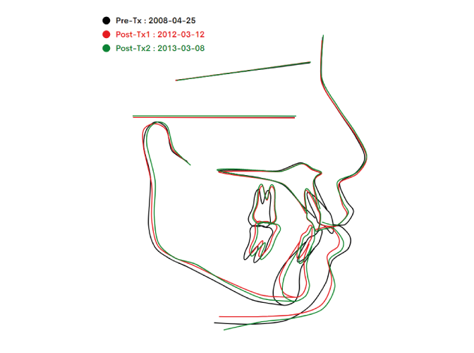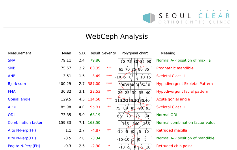 WebCeph PREMIUM provides the ability to compare measurements of different treatment stages in an analysis chart.