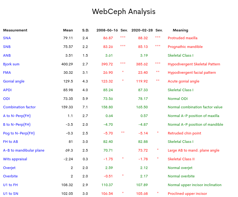 WebCeph PLUS provides the ability to compare measurements of different treatment stages in an analysis chart.