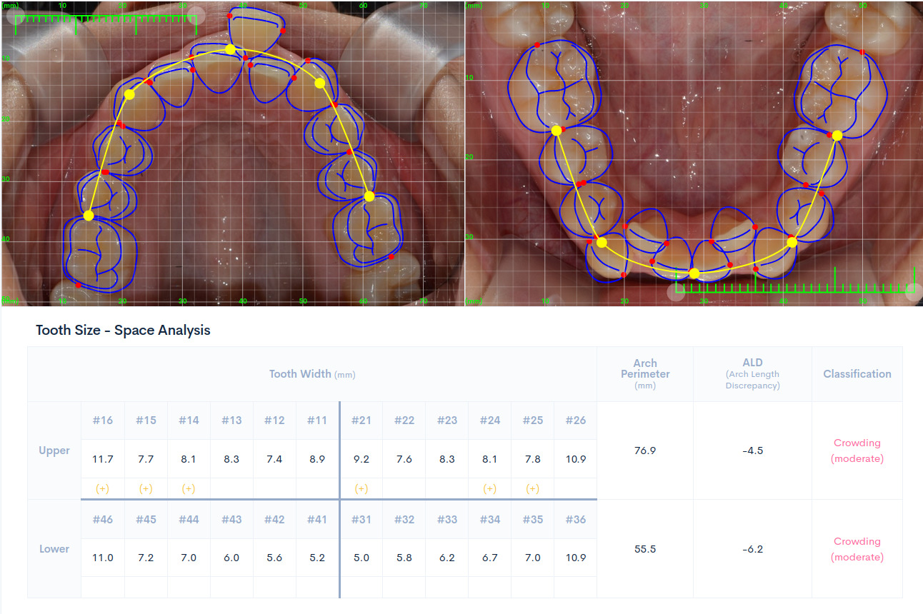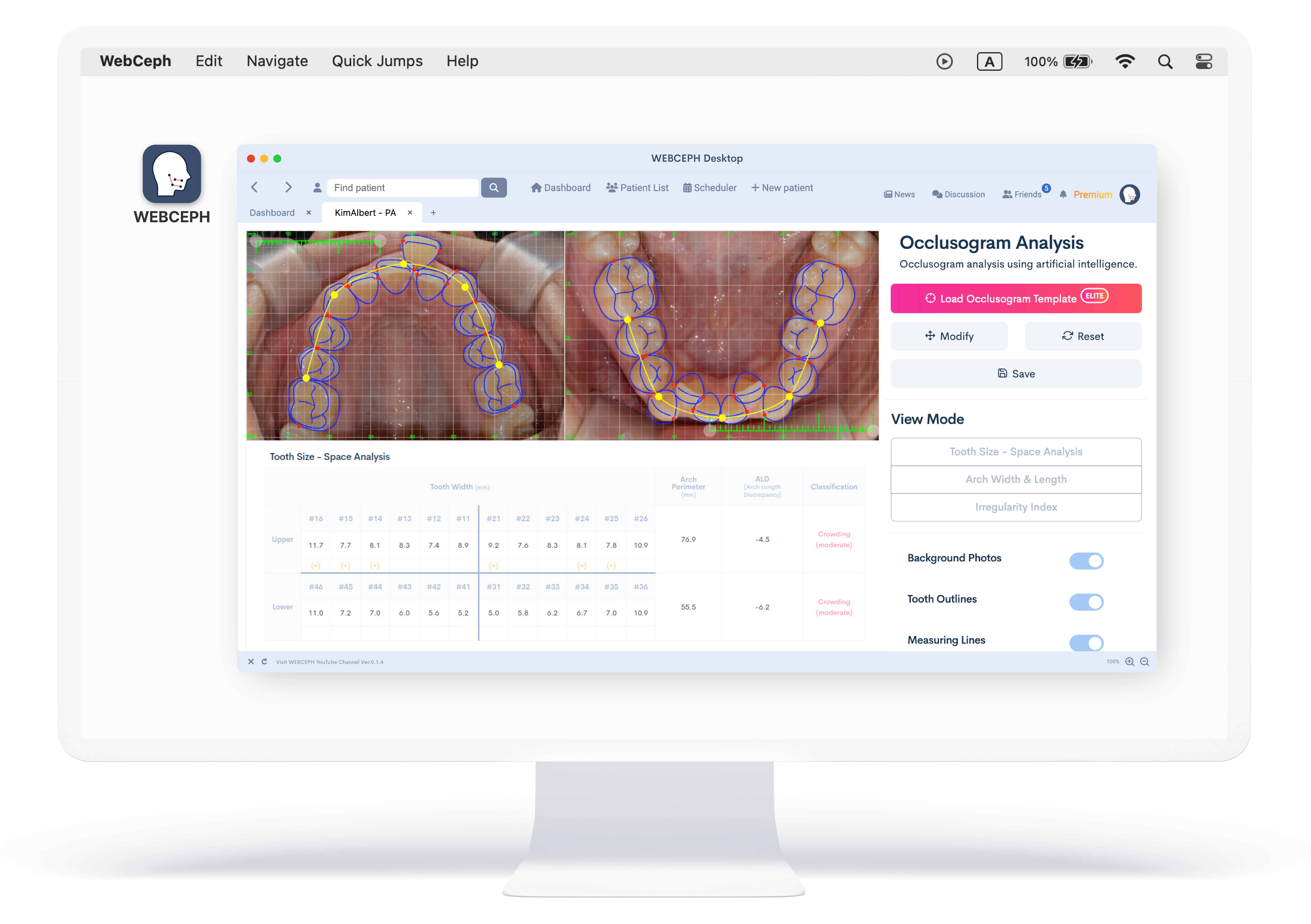 O WebCeph ELITE oferece visualizador de oclusograma com IA, com modelos de arcada e linhas de referência de espaçamento.