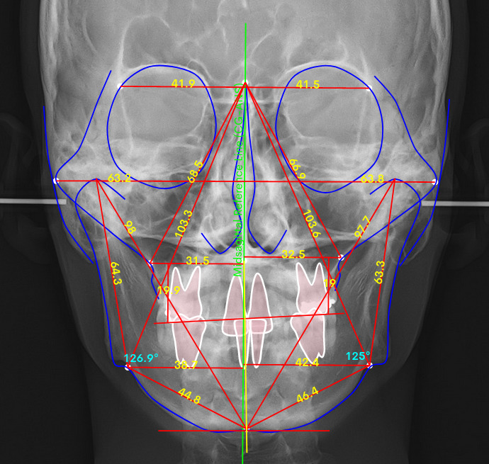 O WebCeph PREMIUM oferece visualizador frontal com IA, com guias de proporção facial como referência visual.